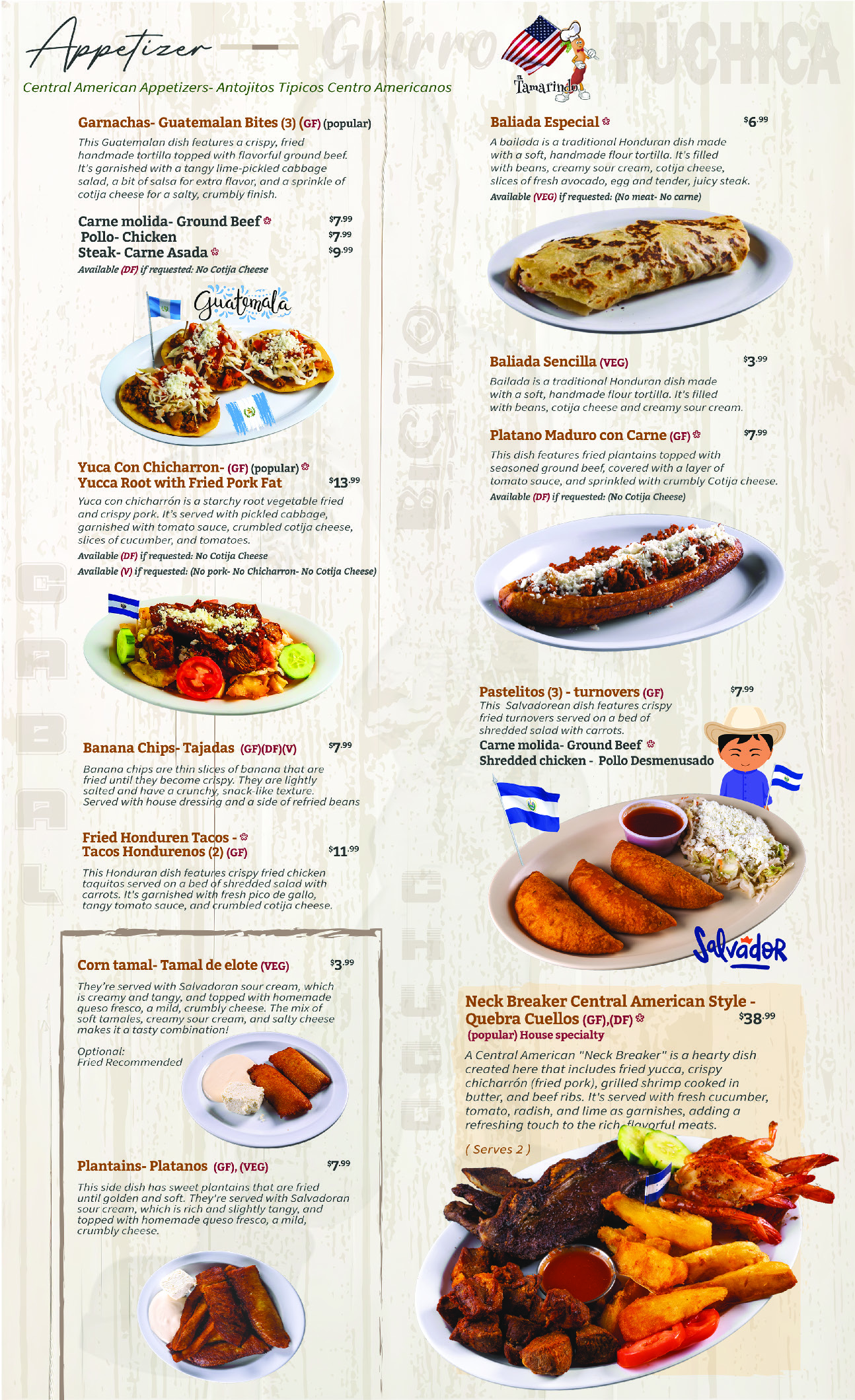 A Central American "Neck Breaker" is a hearty dish that includes fried yucca, crispy chicharrón (fried pork), grilled shrimp cooked in butter, and beef ribs. It's served with fresh cucumber, tomato, radish, and lime as garnishes, adding a refreshing touch to the rich, flavorful meats. This dish is packed with different textures and flavors, combining crispy, savory, and fresh elements for a bold, satisfying meal.