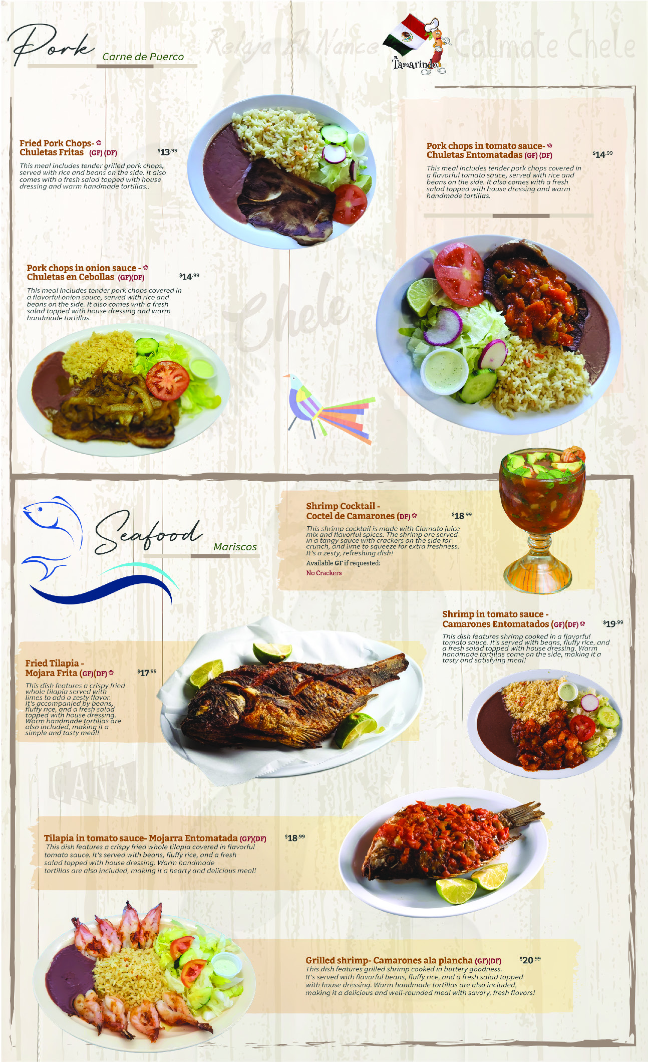 This dish features a crispy fried whole tilapia covered in flavorful tomato sauce. It's served with beans, fluffy rice, and a fresh salad topped with house dressing. Warm handmade tortillas are also included, making it a hearty and delicious meal!