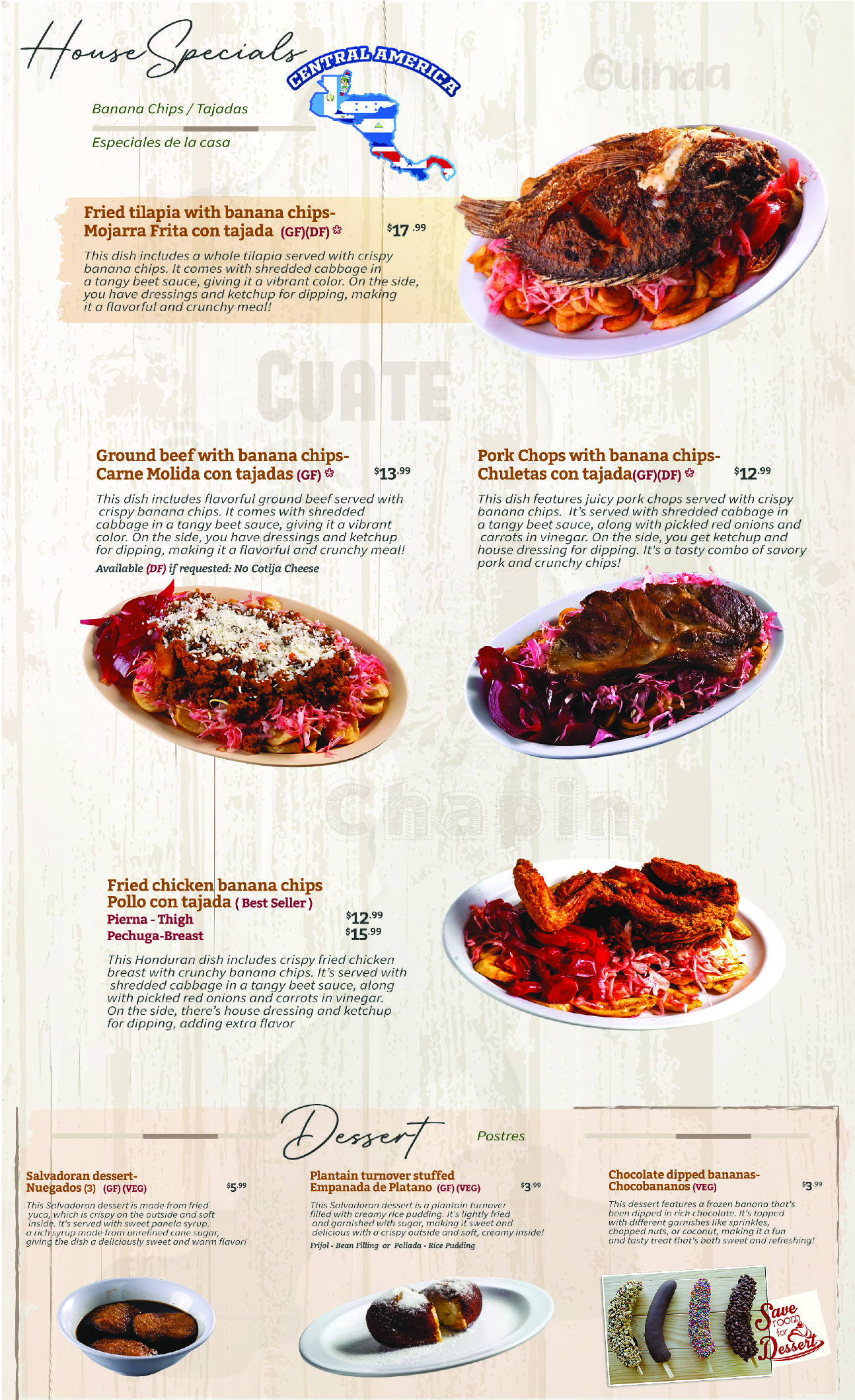 This Honduran dish includes crispy fried chicken breast with crunchy banana chips. It’s served with shredded cabbage in a tangy beet sauce, along with pickled red onions and carrots in vinegar. On the side, there’s house dressing and ketchup for dipping, adding extra flavor. The meal is a mix of crispy, tangy, and savory goodness!
